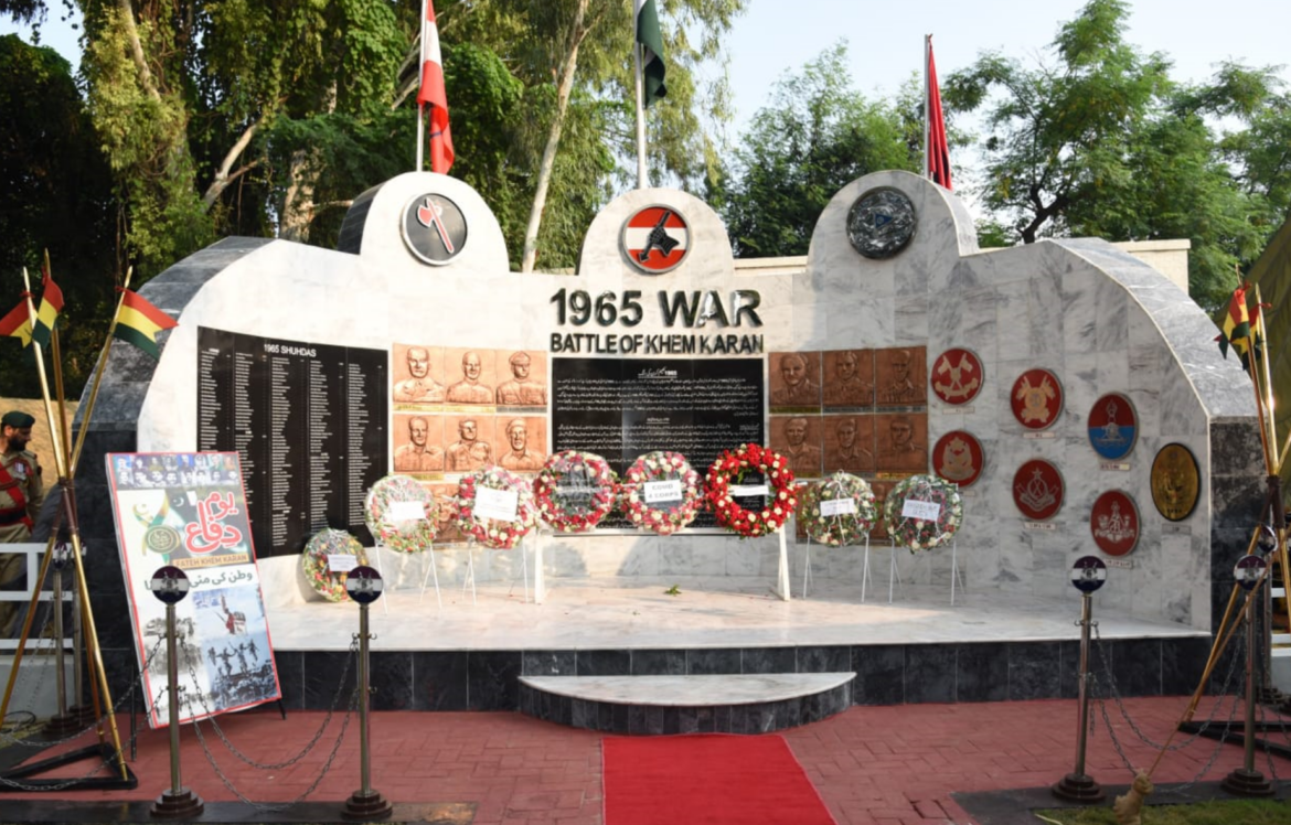 کور کمانڈر اور دیگر نامور غازیوں نے یادگار پر پھولوں کی چادریں چڑھائیں ان غازیوں میں 1965 کی جنگ میں کھیم کرن کے محاذ پر لڑنے والے 5 فرنٹیئر فورس کے کرنل ممتاز، 2 فرنٹیئر فورس گائیڈز کے بریگیڈیئر یعسوب اور 12 میڈیم رجمنٹ آرٹلری کے بریگیڈیئر امتیاز ملک شامل تھے قصور کے سرحدی علاقے میں 1965 کی جنگ کے مشہور معرکہ کھیم کرن کی یاد میں تعمیر کردہ یادگار پر اس جنگ میں حصہ لینے والی یونٹس کے ریٹائرڈ اور حاضر سروس افسران اور جوانوں نے شرکت کی یہ یادگار ان شہدائے وطن اور غازیوں کو خراج عقیدت پیش کرنے کے لیے بنائی گئی جنہوں نے روہی وال کے مشہور جوابی حملے میں دشمن کے چھکے چھڑا کر کھیم کرن تک کا علاقہ فتح کر لیا اس معرکہ میں پاک فوج کے 257 سپوتوں نے دھرتی ماں کے تقدس پر اپنی جانیں نچھاور کیں 16 غازیوں کو ان کی بے مثال جرأت اور بہادری پر اعلی فوجی اعزازات سے بھی نوازا گیا ان میں 1 ہلال جرأت، 6 ستارہء جرأت، 5 تمغہء جرأت اور 4 امتیازی اسناد شامل ہیں باٹاپور میں 3 بلوچ رجمنٹ کے شہداء کو خراج عقیدت پیش کیا گیا، جس میں لیفٹیننٹ جنرل (ریٹائرڈ) خالد نواز نے خصوصی طور پر شرکت کی۔ انہوں نے 6 ستمبر 1965 کے شہداء کو سلامی پیش کی 6 ستمبر 1965 کو کیپٹن انور اور 3 بلوچ رجمنٹ کے 36 بہادر سپاہیوں نے بٹاپور کے علاقے میں بھارتی فوج کو داخل ہونے سے روکنے کے لیے اپنی جانیں قربان کیں اور دشمن کے ٹینکوں کو تباہ کر دیا۔ انہوں نے اپنے ملک اور قوم کی بہتری کے لیے اپنی جانوں کا نذرانہ پیش کیا مانی صاحب میں میجر جنرل معین ادیں شہید کی مرقد پر بھی پاک فوج کے چاق و چوبند دستے نے سلامی دی اور پھولوں کی چادر چڑھائی آرمی میوزیم میں شاندار فوجی نمائش کا انعقاد کیا گیا جس میں شہریوں اور خاص طور پر خواتین اور بچوں نے حصوصی دلچسپی اور اس روایت کو آیندہ بھی جاری رکھنے کی خوایش کا اظہار کیا.